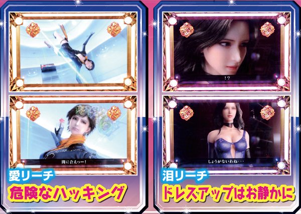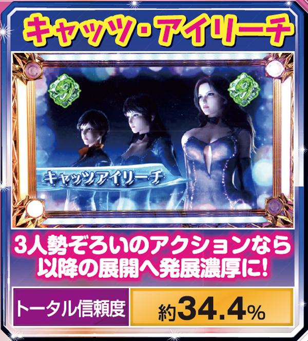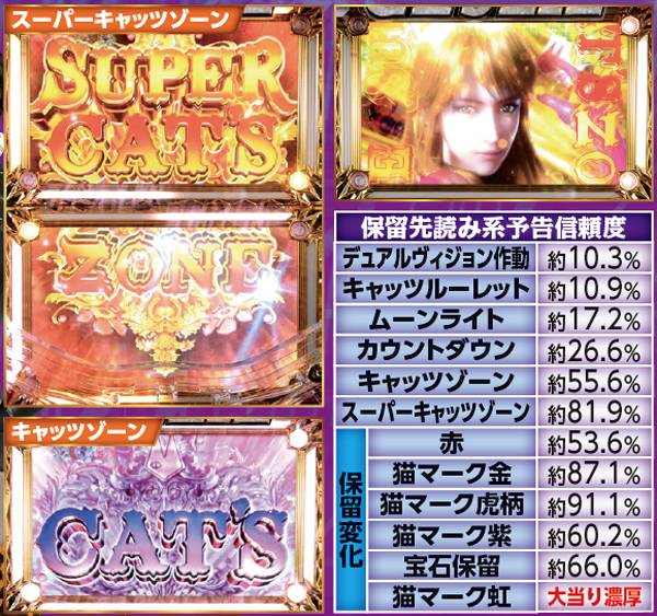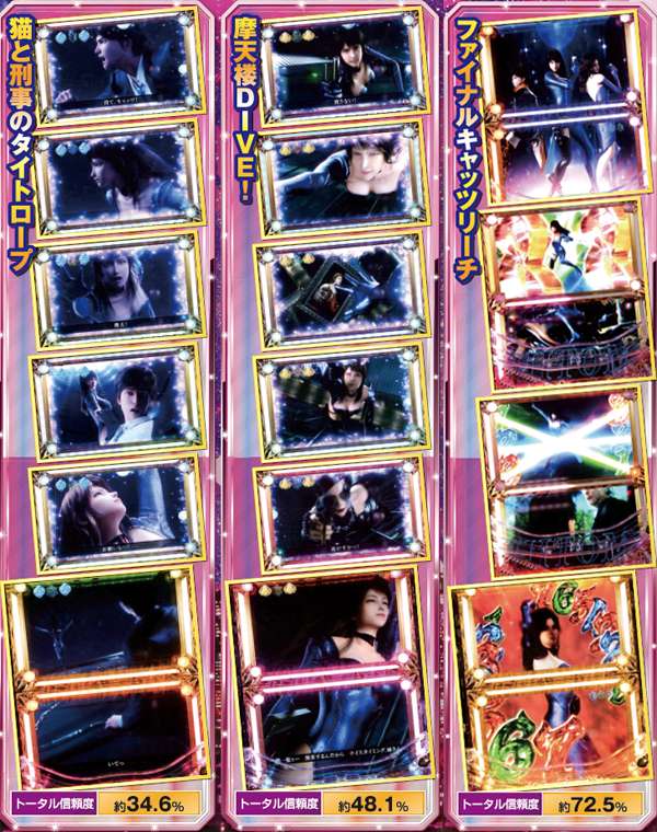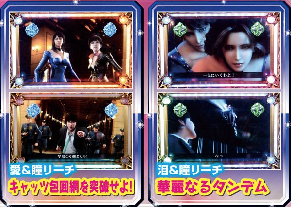 ノワール図柄テンパイで、キャッツ・アイ3人とのバトルが発生。演出は4種類あるがいずれも、キャッツ・アイの誰かが勝利すれば15R大当り。また、負けても1R獲得でST継続は保証されるぞ。