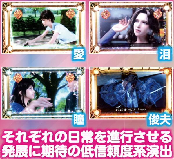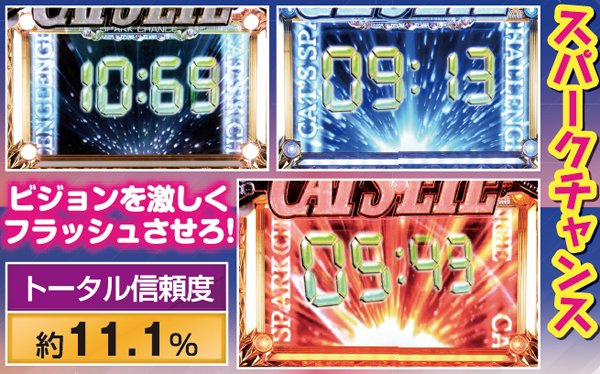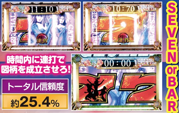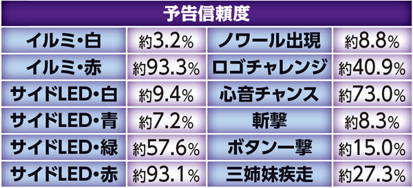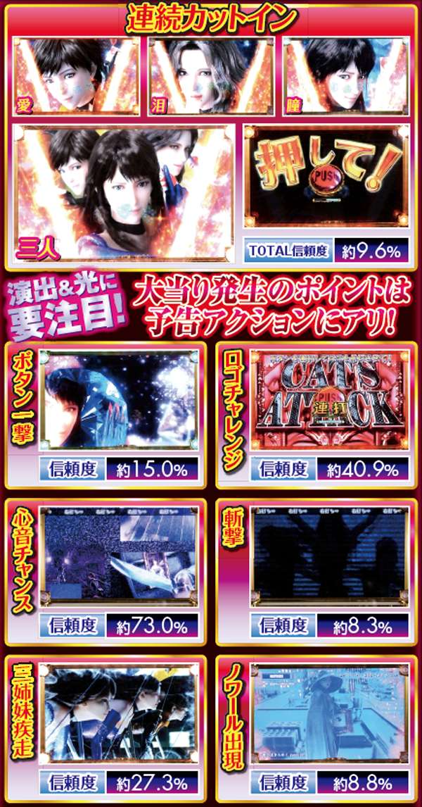 多種多様な予告がひっきりなしに発生するST中だが、心音チャンスやロゴチャレンジ発生ならチャンスに。連続カットインは頻繁に発生し信頼度も低いが、実戦では多くの大・小当りに絡んでいため、なかなか軽視できない予告と言えよう。
