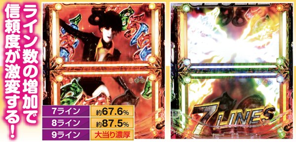 リーチが進行しながらキャラがラインを増やしていくほど、信頼度は上昇。9ラインになれば大当りも濃厚に。