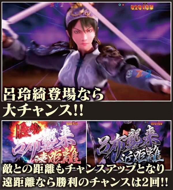 確変81回転目からは呂布&呂玲綺が敵となる超高速消化モードへ。敵の種類&距離がチャンスアップとなり、呂玲綺+遠距離であれば、勝利=16Rの大チャンスだ。