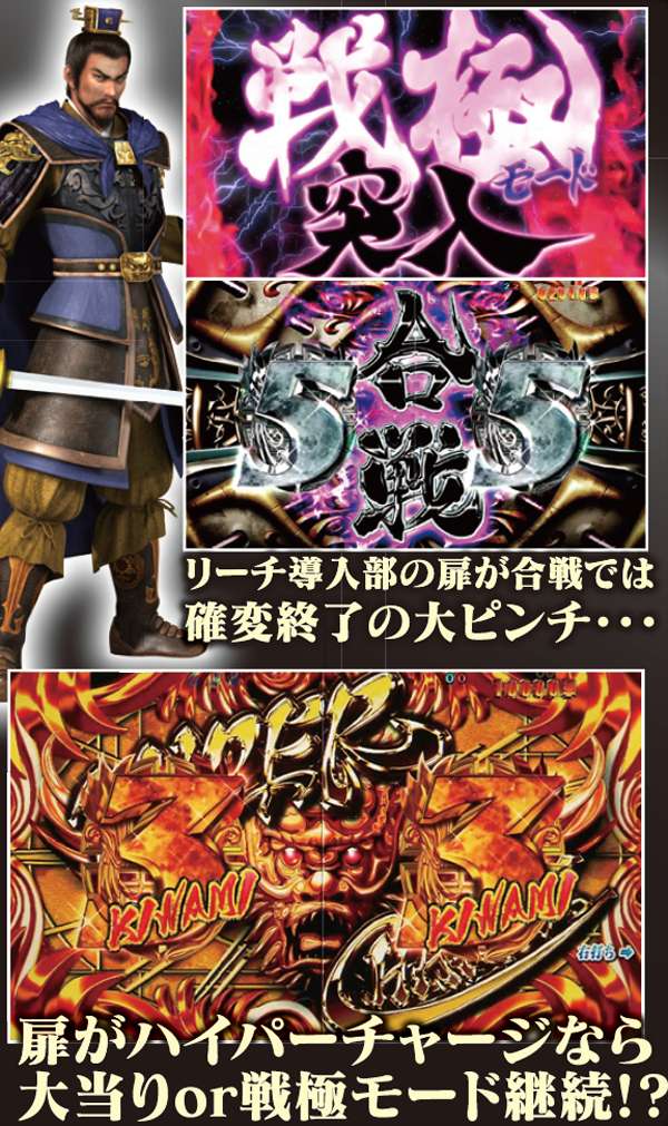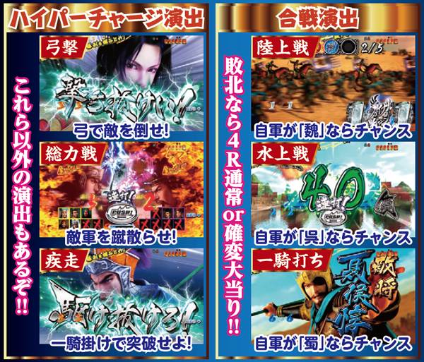 80回転までは扉を契機に2つの演出パターンに分岐する。大分して合戦ならピンチ、ハイパーチャージならチャンスと覚えればOKだ。戦に勝利すれば16R獲得となる。