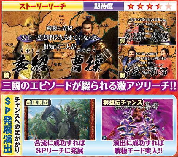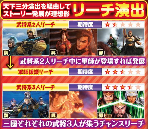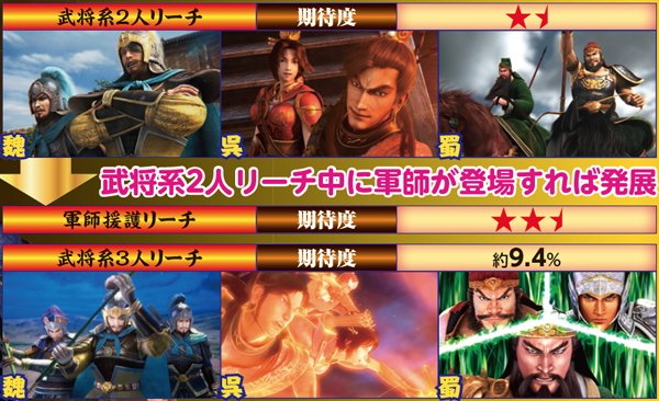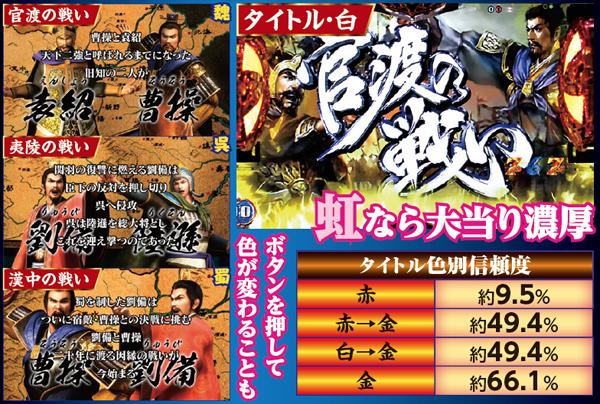 ストーリーリーチでは魏なら官渡の戦い、呉なら夷陵の戦い、蜀なら漢中の戦いという有名なエピソードが展開される。タイトルの色によって信頼度が大きく変化する仕組みで、赤以外なら激アツだ。