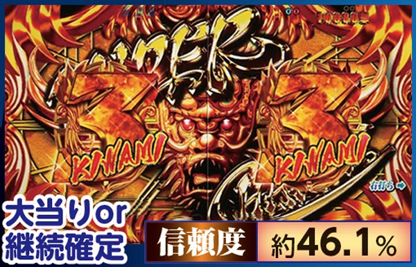 通常時の数ある演出の中でも特に重要なのが大放出演。飛び出す文字の種類で信頼度が大きく変化する仕組みで、「激アツ」なら50%オーバーの高信頼度に。また、発展先の法則が崩れた場合も大チャンスとなる。
