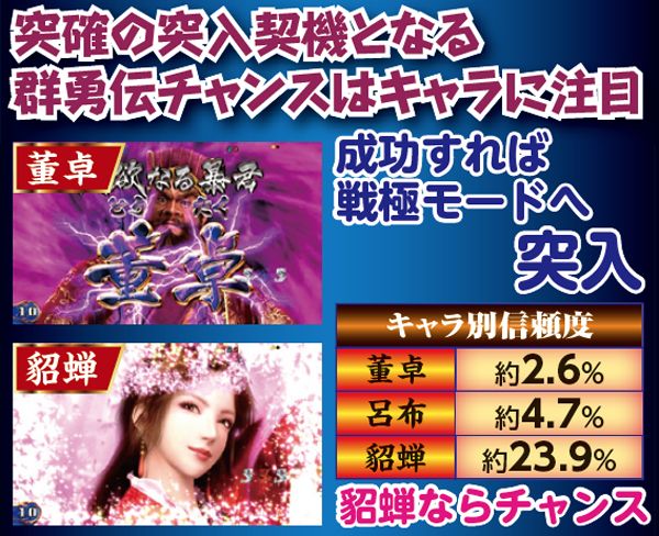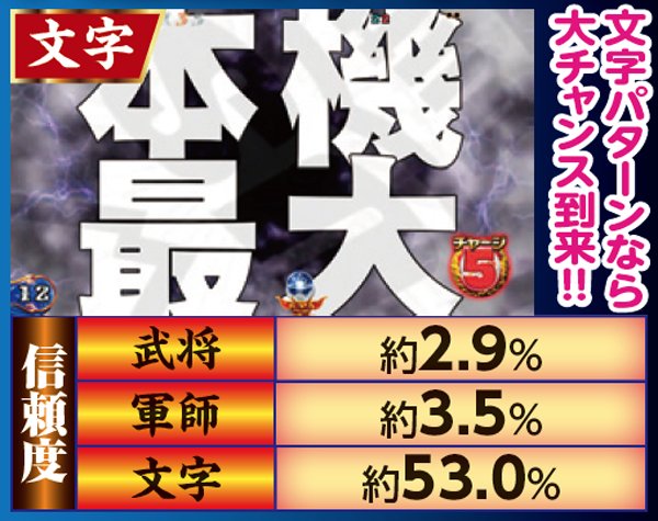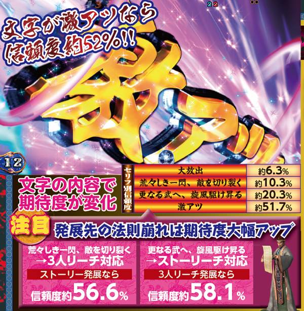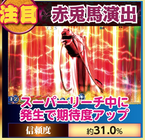 リーチ信頼度を底上げしてくれるチャンスアップパターンも多数存在。リーチ中に赤兎馬が出現した場合には信頼度が30%オーバーに。テロップの色や画面左下のキャラにも要注目だ。