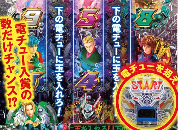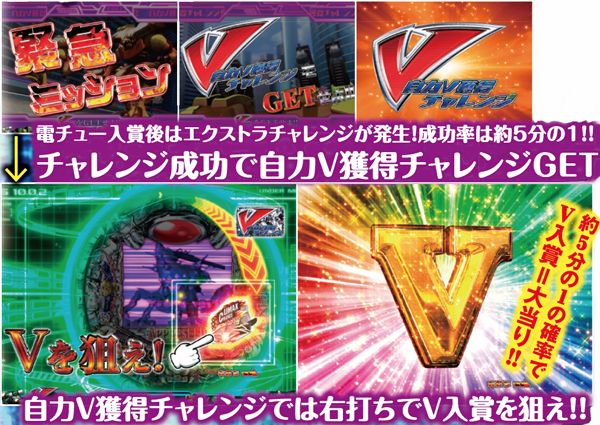 | 機種概要 | Wスタートシステムにより、図柄揃い以外にもドットからV入賞を狙える。フェイクを契機に発生する自力V獲得チャレンジ成功率は5分の1、さらに5分の1の壁を超えれば大当りとなる。 |