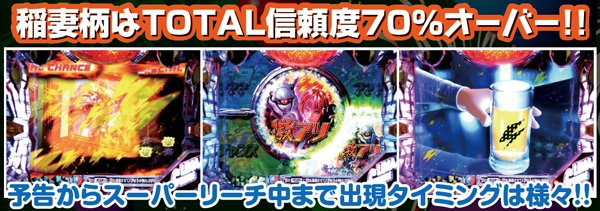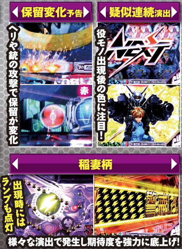 保留変化や疑似連などで金系演出が発生すれば期待度大幅アップ。ヘソ横のランプも点灯する稲妻柄はもちろん激アツだ。