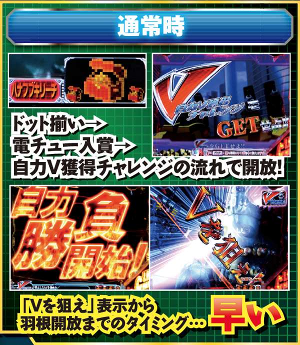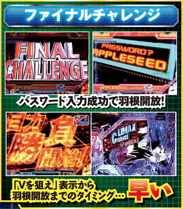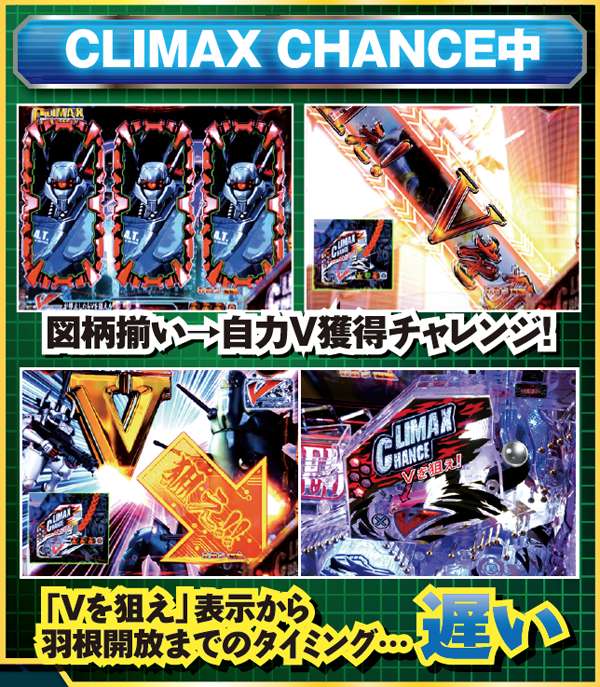 上記の通り、状態によって「Vを狙え」表示から羽根開放までの時間に差がある。CLIMAX CHANCE中は余裕があるので、通常時&ファイナルチャレンジでは油断せず早めに打ち出すようにしよう。