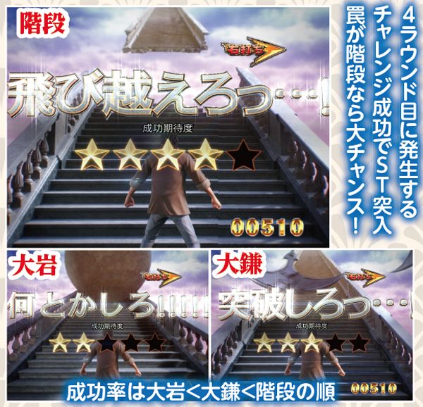 3・7以外の図柄揃いで発生する。大岩、大鎌、階段の順で期待度が高く、階段なら成功の可能性が高い。
