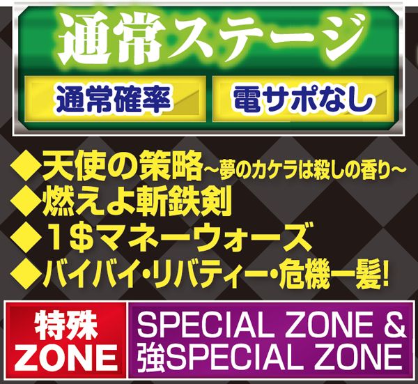 通常時は4つのステージが存在。ある契機を境に高期待度の特殊ゾーンへ。前作の不二子ゾーンor7ゾーンのような存在か。