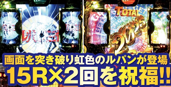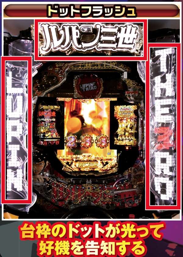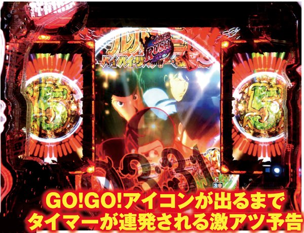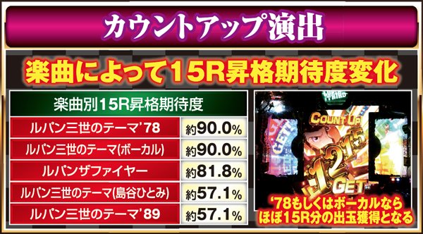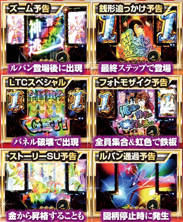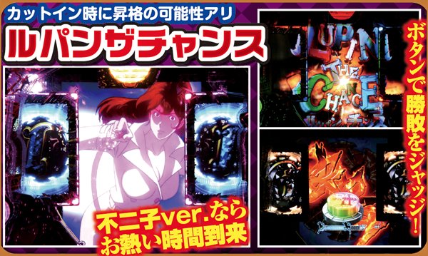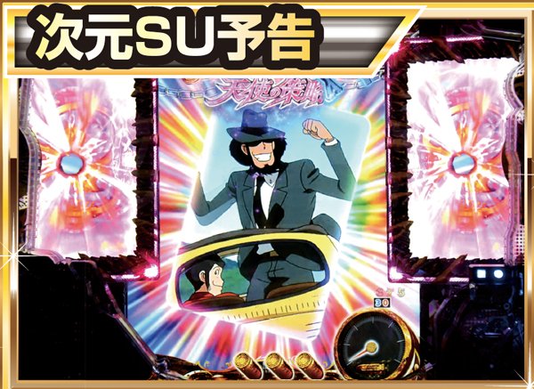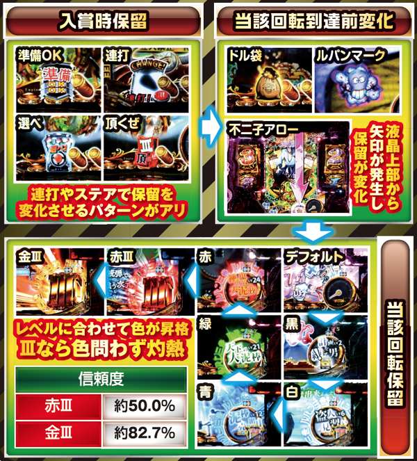 チャンスの起点であり見応え抜群の保留変化。入賞時もさることながら、当該回転でどれだけレベルアップするかが重要となる。ルパンたちの乗った愛車が登場すれば大幅アップのチャンス、3人がそろい踏みすれば赤以上に変わる好機だ。