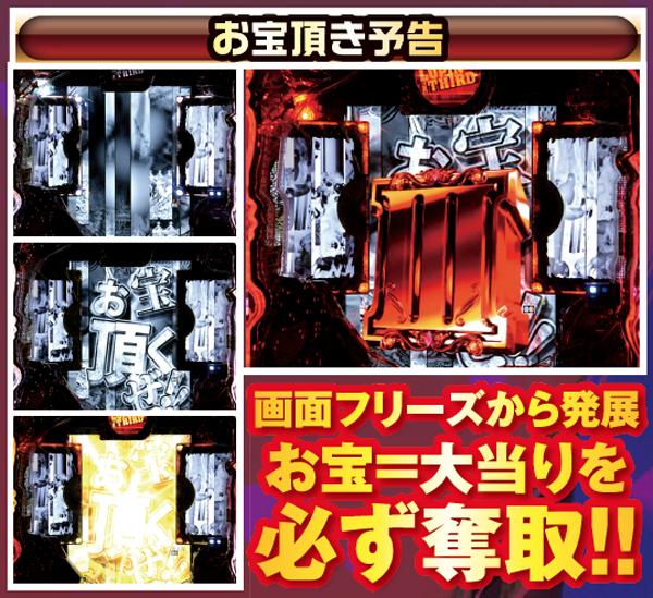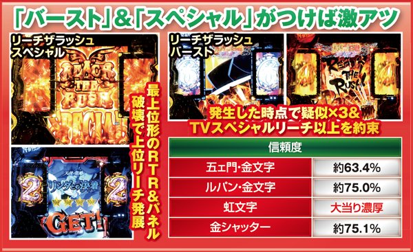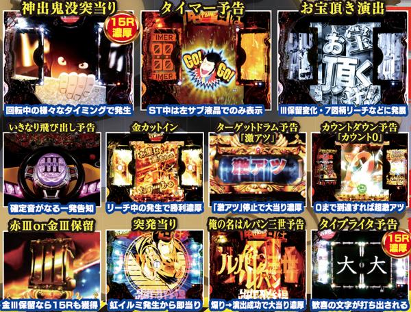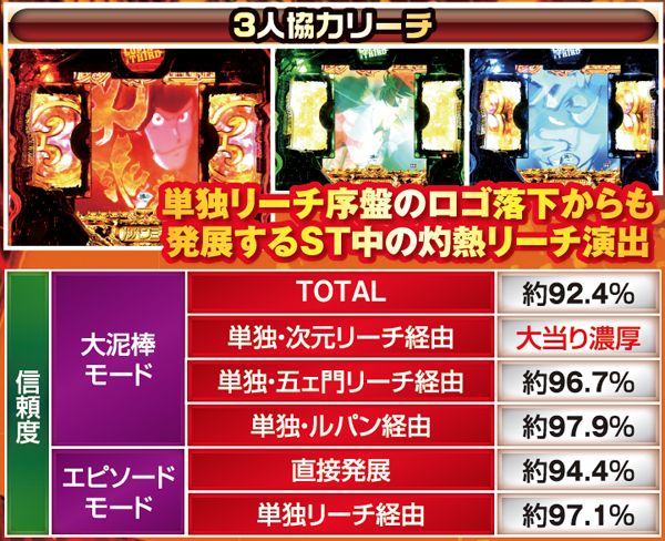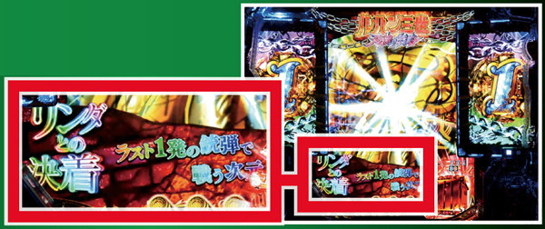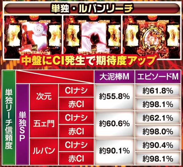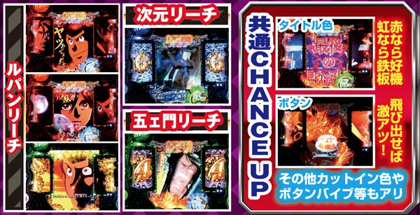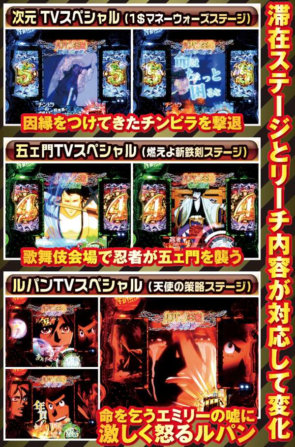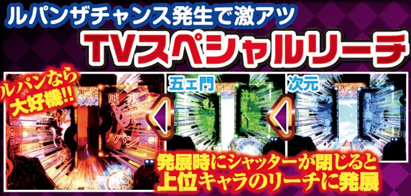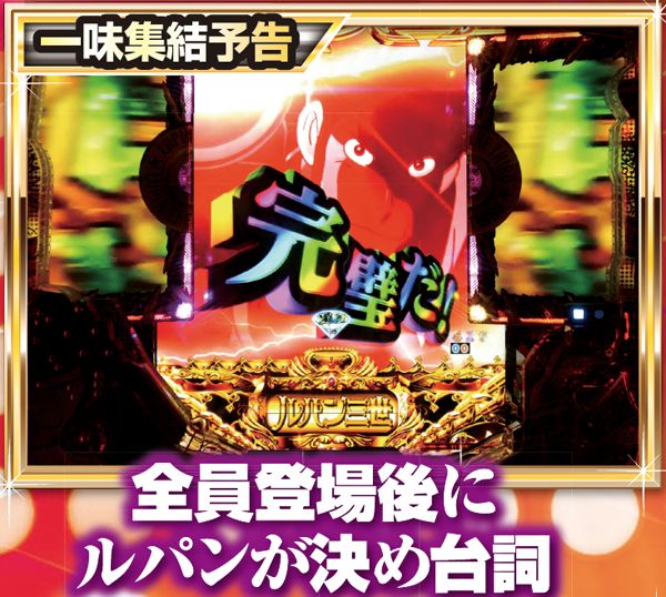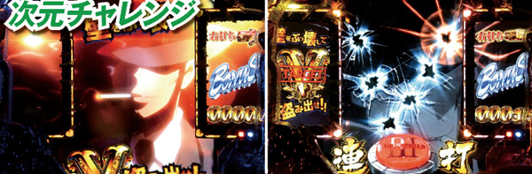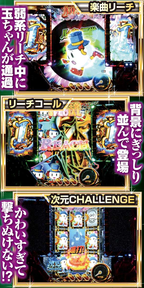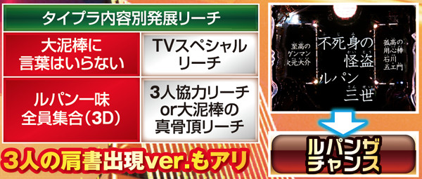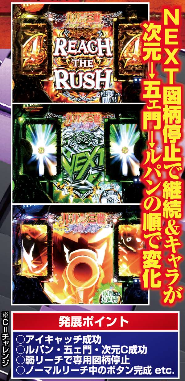 保留変化と並び、予告の機軸となるリーチザラッシュ。次元からはじまり、継続すれば五ェ門、ルパンとキャラが変わるが、3人が集結するパターンも。開始時のチャンスアップにも注目。