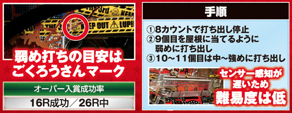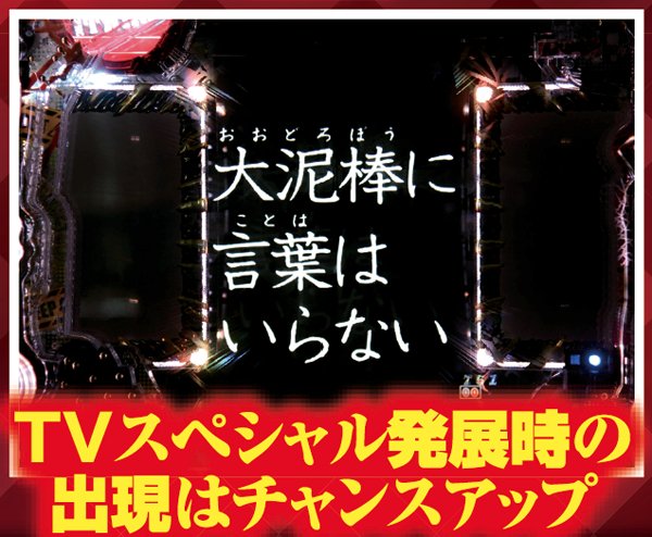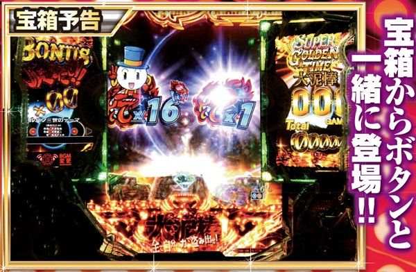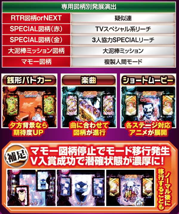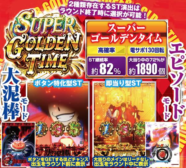 V入賞すれば継続率約82%のスーパーゴールデンタイム。大当り時の7割以上で約1900個ほどの出玉が獲得できる。ST中はボタン演出メインの大泥棒モードと即当りメインのエピソードモードの2種類のST演出が楽しめる仕組みだ。