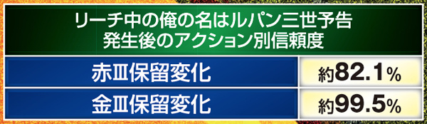 俺の名はルパン三世出現後に保留が金Ⅲに変われば信頼度99%超。なお、俺の名はルパン三世が1回転で2度出れば大当り濃厚だ。