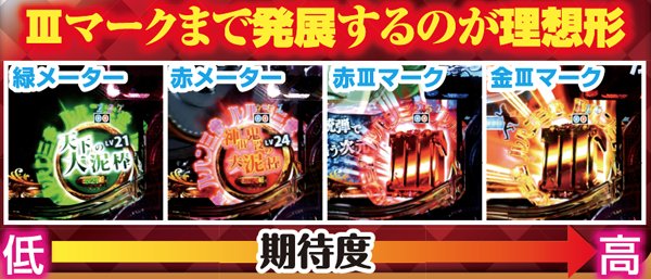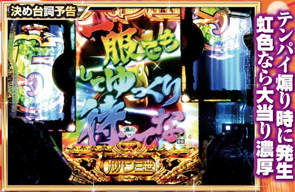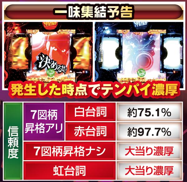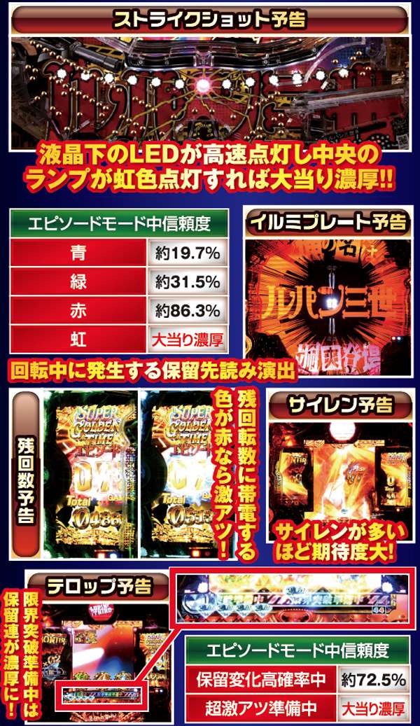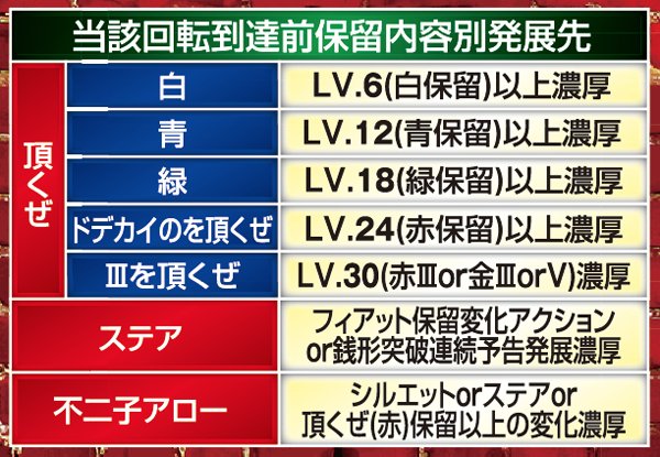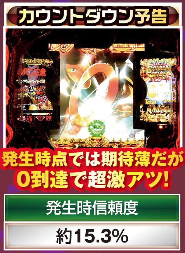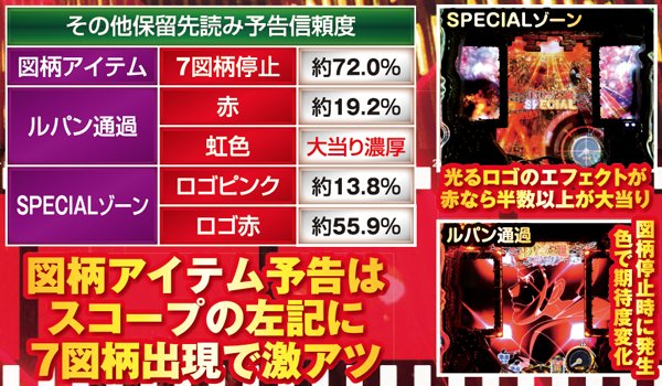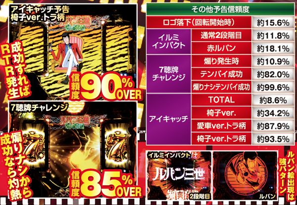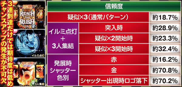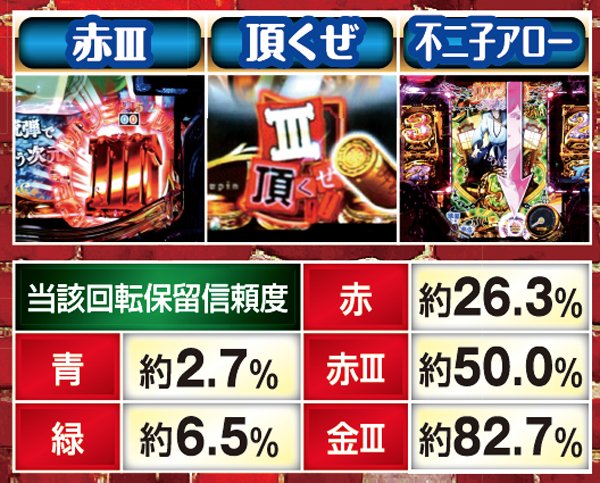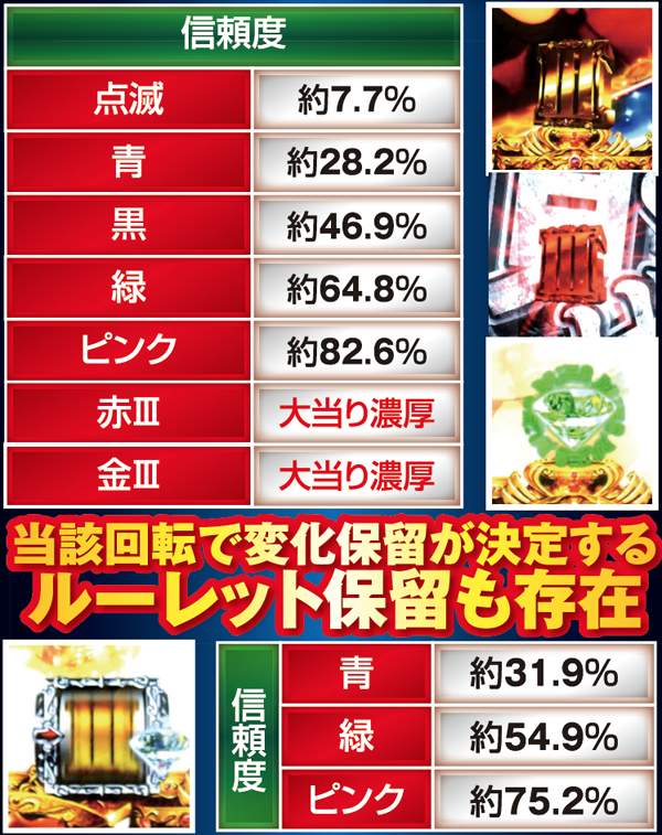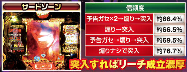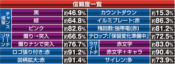 先読みのなかで最重要なのがイルミ。青のままでは弱いが、青から緑、赤と進めば大当りは目前だ。サードゾーンは煽りなしが最強だが、煽り付きでも信頼度は66%を誇る。