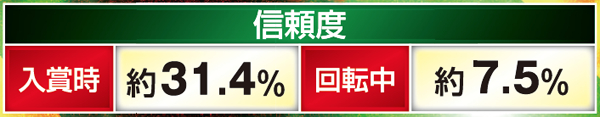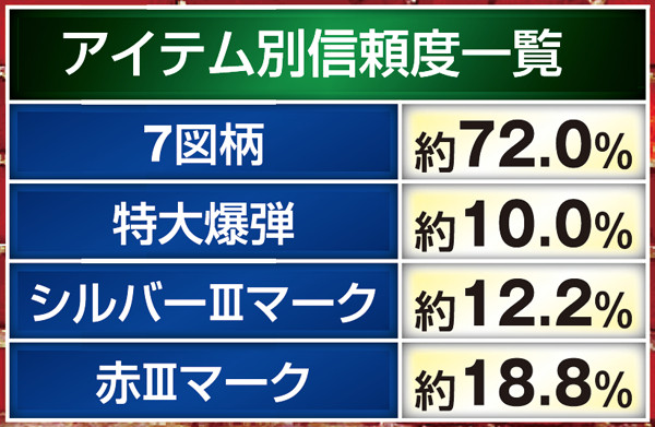 画面中央に表示される図柄アイテム。赤Ⅲなどは滅多に出ないとあって、つい期待してしまうが、信頼度は19%弱。最高形は金色に輝く7図柄だ。