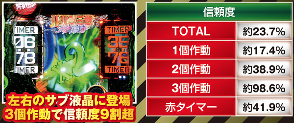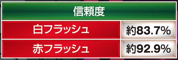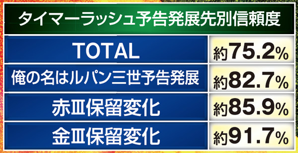タイマー出現時で最もアツいのがラッシュへの発展。トータル信頼度は75%超、赤Ⅲでも8割を超える。最終の当落シーンまでラッシュが続けば大当り濃厚だ。