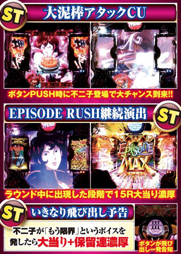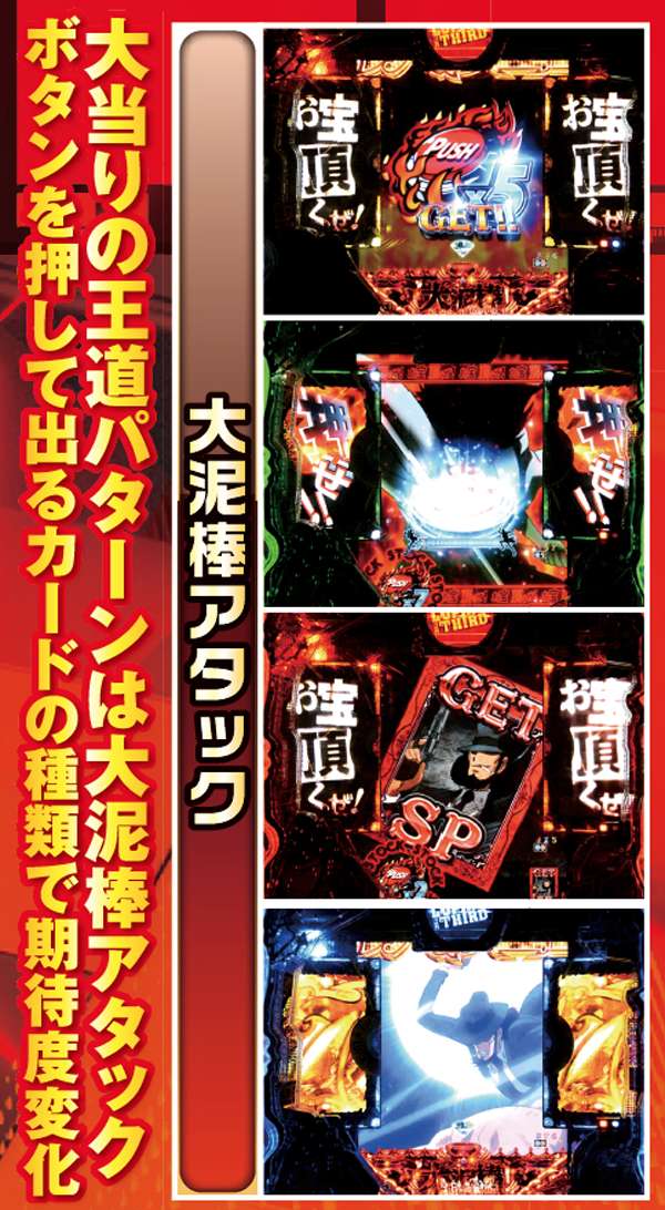 主な発生ポイントは、ルパンが愛車に乗り込むスーパー発展時。ボタンの飛び出しが煽りでなく何度も続けば激アツの決め演出の合図だ!