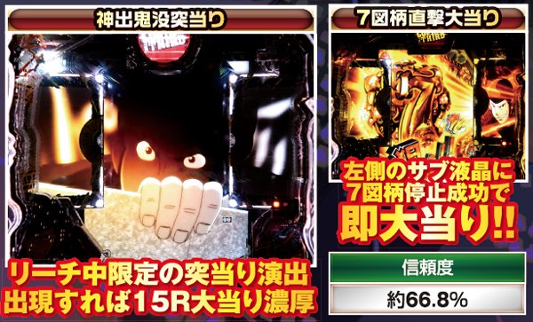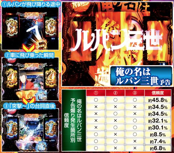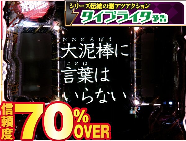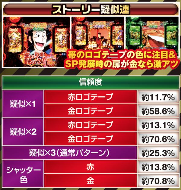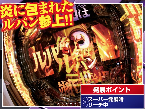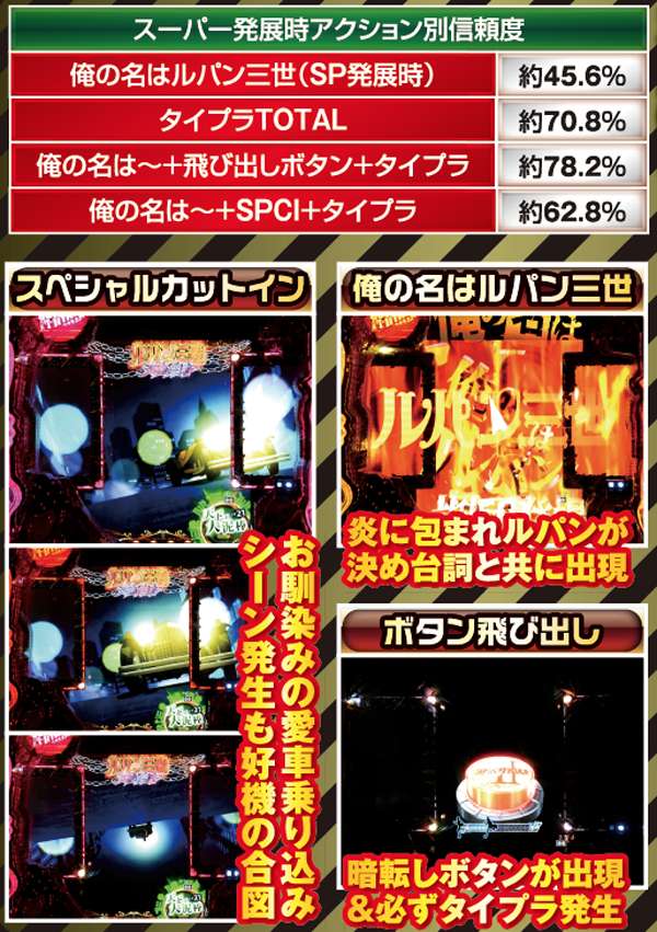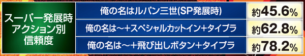 スーパー発展時に俺の名はルパン三世が発生すれば信頼度45%以上と激アツ。さらにボタン飛び出しからのタイプラが続けば信頼度は8割近くまで上昇する。