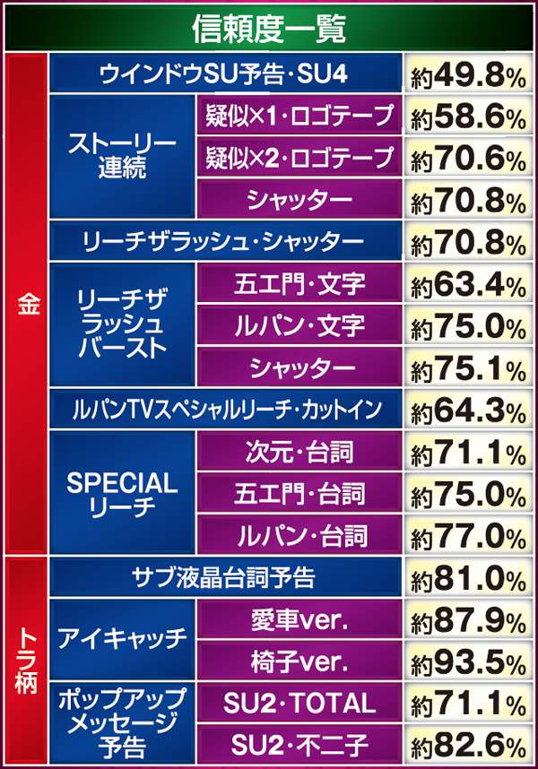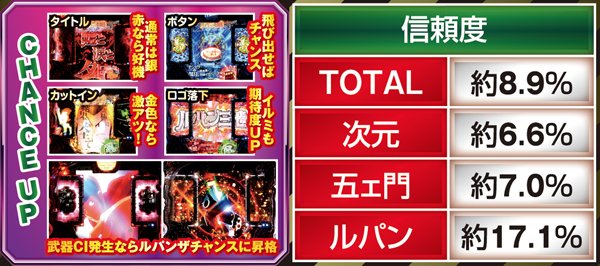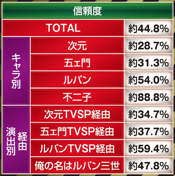 ルパンだけは2桁の信頼度を誇るが、主な発展先とあって期待度は低め。強めのチャンスアップの複合や、さらなる発展に期待だ。