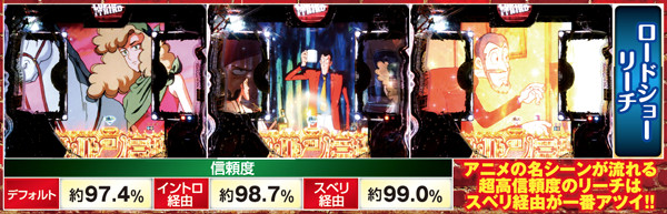 アニメの名シーンを切り取ったロードショーの信頼度は98%超! ルパンたちの単独リーチの信頼度も軒並み大泥棒モードより高めとあって、テンパイすれば否が応でも期待が高まる。