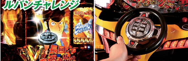 STを賭けた演出は、初当りのラウンド中に発生。ルパン、次元、五エ門がそれぞれ活躍する3種類が用意されており、車のハンドルを模したステアで自由に選ぶことができる。いずれもチャレンジに成功すれば灼熱のSTに突入。失敗した場合はタイプに期待だ。