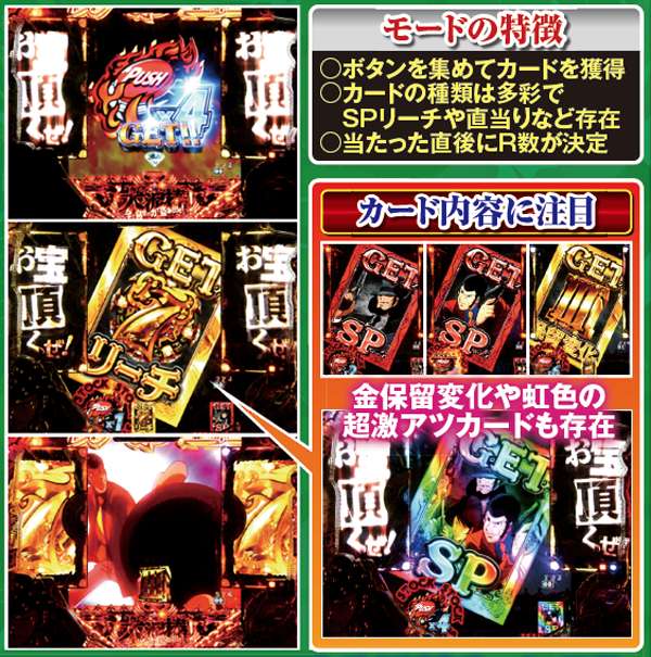 回転中にボタンアイコンを集めれば、その数だけボタンを押して様々なカードが獲得できる。序盤はリーチや保留変化が大半だが、後半だと大当りやラウンドが獲得できることも。