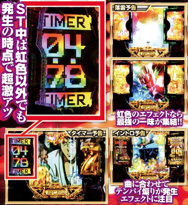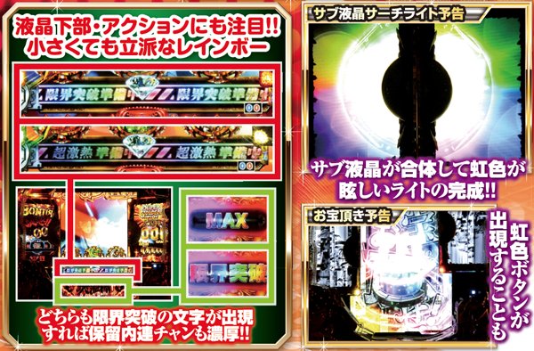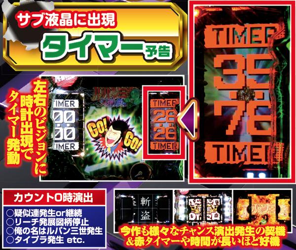 前作で重要な役割を担ったタイマーは、左右のサブ液晶に表示。今回も赤ならチャンスアップとなる。そのほかにも左右両方での出現や、絶え間なく出てくるラッシュなどがある。