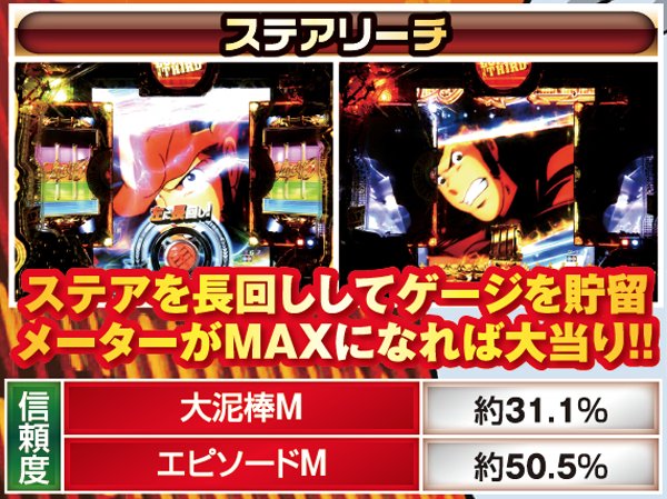 アニメの名シーンが流れるリーチで、滞在ステージによりアクションが変わる。終盤のカットイン後にルパンらが出現すればルパンザチャンスに発展だ。