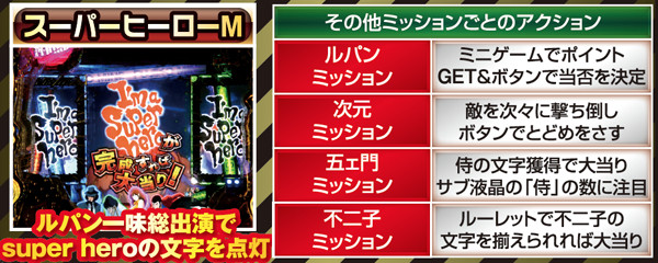 不二子を含めた4人各々のミッションが楽しめる参加型演出。ミッションを達成すれば即大当りで、スーパーヒーローMは文字全点灯で大当りに。