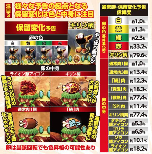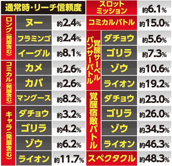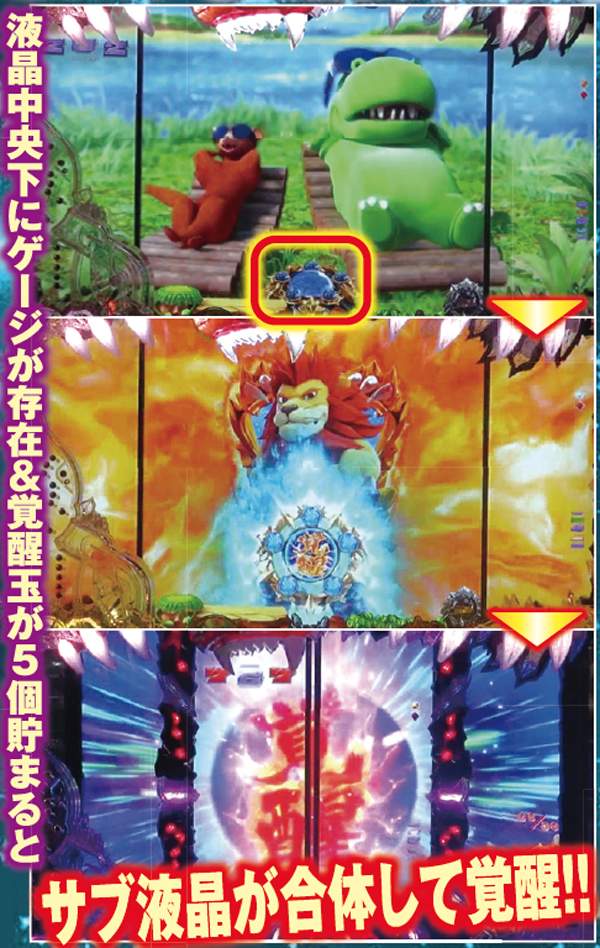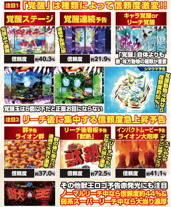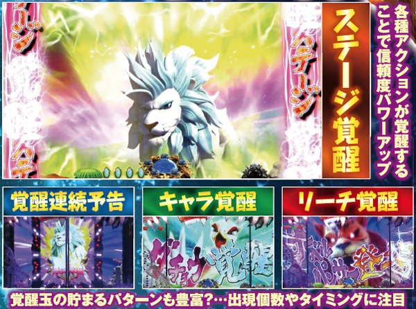 覚醒アクションは多彩に存在するが、シマウマ予告の覚醒動物4体や覚醒ステージといった一部を除き、信頼度は20%前後と単体では心許ない。そのため、初当りにはリーチ後の強予告や赤以上の保留変化など、高信頼度を誇る演出の複合が必須となる。