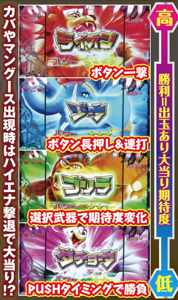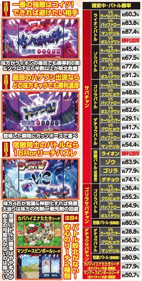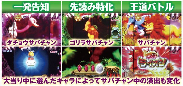確変中の演出は王道バトルが展開されるサバチャン、ゴリラが主役のゴリラサバチャン、ダチョウが主役のダチョウサバチャンの3週類から選択可能。いずれのモードもバトルの組み合わせによって勝率が激変し、敵がサーベルパンサーなら敗北の大ピンチで、ハゲワシなら勝利濃厚となるのだ。