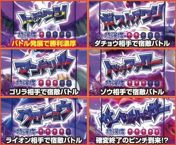 サバンナチャンス中は3つのモードから好きな演出を選択できる。いずれのモードでも、猛獣達が覚醒する「宿敵バトル」発展なら激アツ。バトル勝利で16R獲得となるぞ。