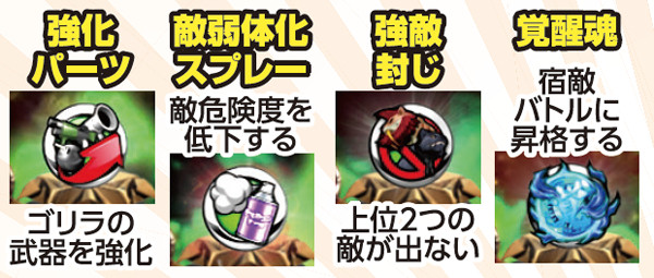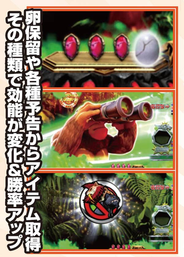 ゴリラが主役の先読み重視モード。卵保留や回転中の予告から発生するアイテムに注目で、その種類によって効果や勝率が変化する。もちろん、アイテムがなくても勝機はあるが、バトルを有利に進めるためには必要不可欠だ。