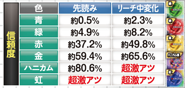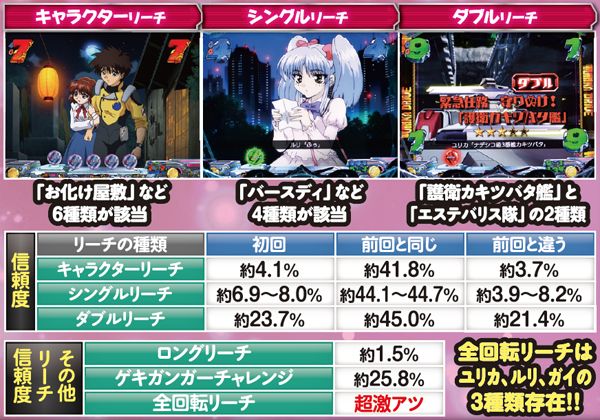 各スーパーは前回と同じ演出かどうかで信頼度が激変。同一のリーチが連続すれば無条件で半数近くが大当りに。