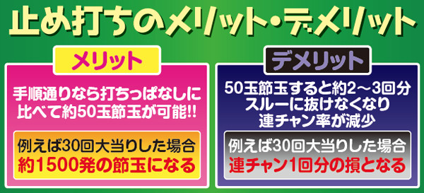 止め打ちをすれば大当り1回で50個程度の節玉が可能だが、止めた分だけスルーに向かう玉が減るというデメリットも。ムダ玉を覚悟の上で1個でも多くスルーを通して連チャンを狙う、というのも悪くはないかも。