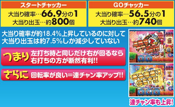 確率と出玉の兼ね合いからするとGOチャッカーの方が甘いので、スタートと同等の回転率が得られるなら右打ちした方が得だが…。