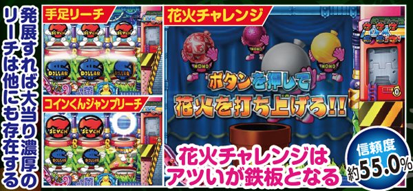 1996年の登場以来シンプルかつ奥深いゲーム性と小粋な出玉性能で人気を博したパチンコ機が平成の世に堂々復活! 現代版らしく演出山盛りなモードも搭載されているが、新キャラも追加された可愛らしいコイン達の動きに一喜一憂する点は変わらない。 |