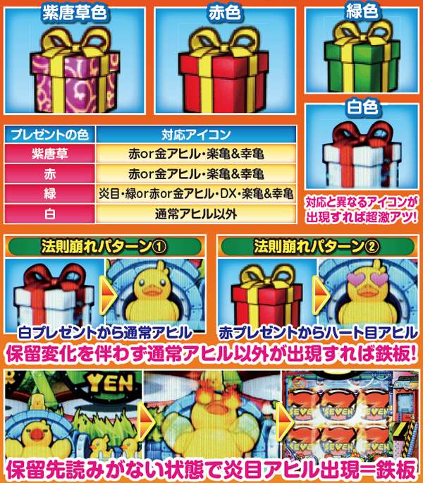 プレゼントの色と各アイコンは対応しており、この関係が崩れるといわゆる法則崩れとなり、大当り濃厚だ。上記パターンを覚えておき、いち早く大当りを察知するのもいいだろう。