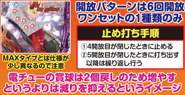 電サポ中の電チュー開放パターンは6回ワンセットの1種類のみなので上の手順のような止め打ちが有効。タイミングは盤面右の状態に応じて要微調整です。