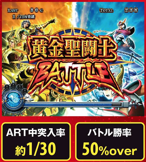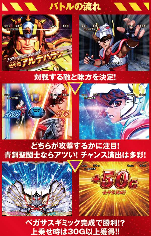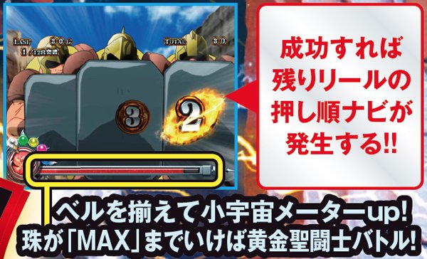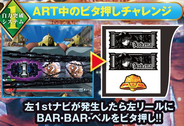『パチスロ聖闘士星矢〜女神聖戦〜』は人気シリーズの3作目でありながら、前作までとは全く異なる斬新なシステムで話題を呼んでいる。 目を引く部分は多岐に渡るが、なんといっても目玉は「自力突破システム」なる新機能。これはプレイヤー自身が視覚(=目押し力)や直感を駆使して勝利を掴み取るシステムで、その機会が訪れるのはART中とビッグ中の2通りある。 |