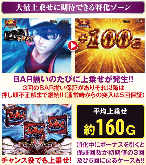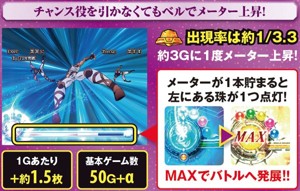 平均上乗せゲーム数約160Gを誇るバーストアタックへはバトル勝利の一部から突入。ビッシビッシBARが揃う快感とゲーム数が加算される快感をまとめて感じることができる。押し順によって停止出目を楽しむこともできるようだ。