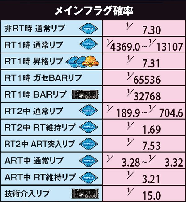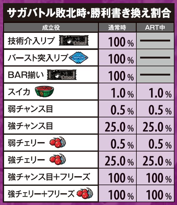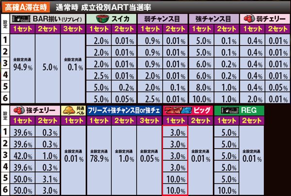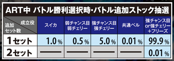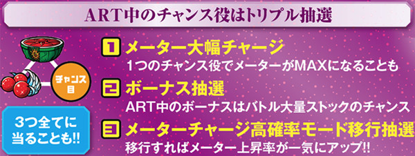 強チャンス目・スイカ・強チェリーの3役はART当選の期待度が高めなので前兆突入に期待。反対に弱チェリーなどはART当選よりも高確移行の契機となっていることが多いようだ。