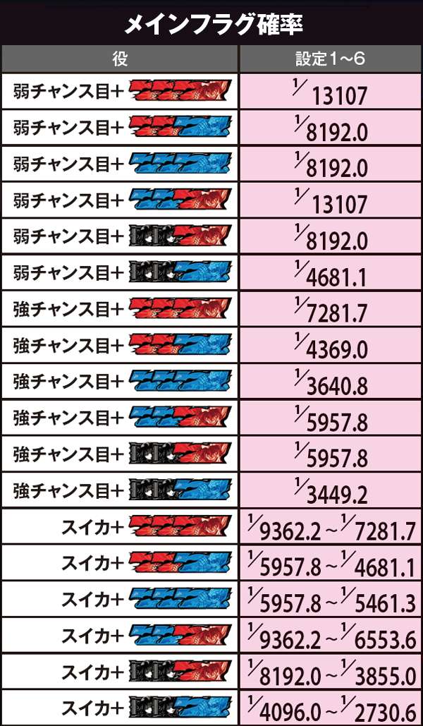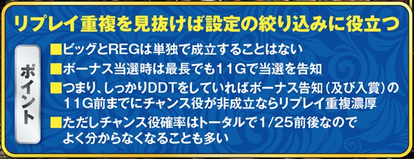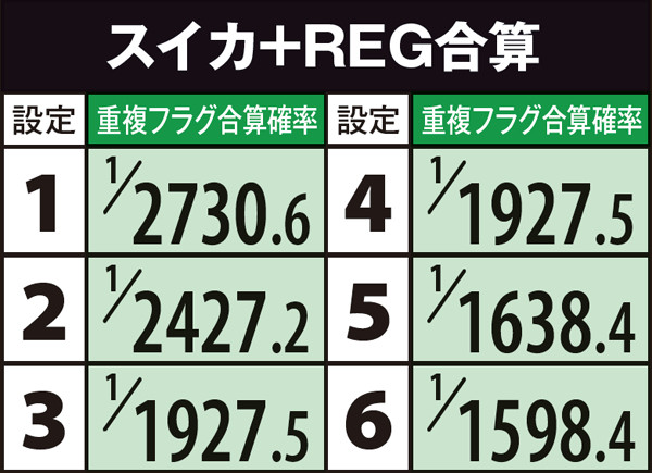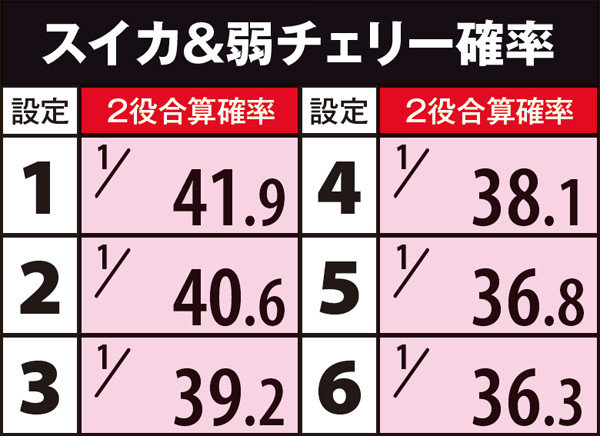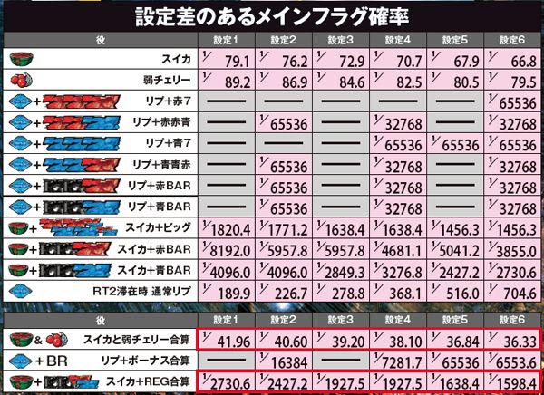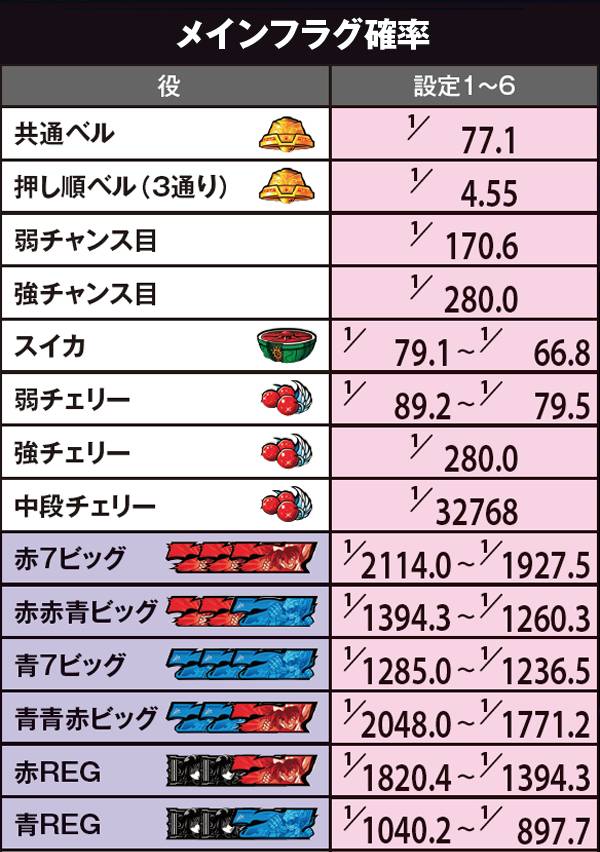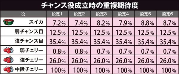リプレイとボーナスの重複フラグは特定の設定しか出ないので設定の絞り込みに役立ちそうだが、実際には確率がかなり低いのが難点。実用性の高い「スイカ&弱チェリー」と「スイカ+REG重複」をメインの設定推測材料として活用しよう。