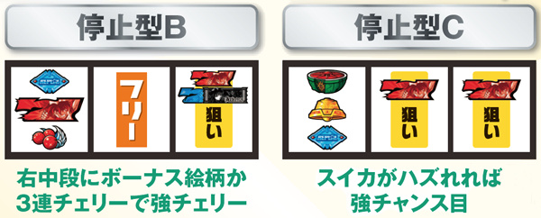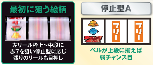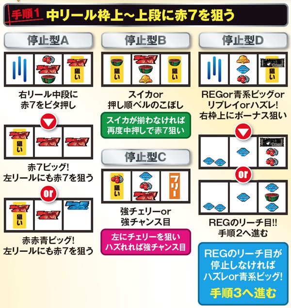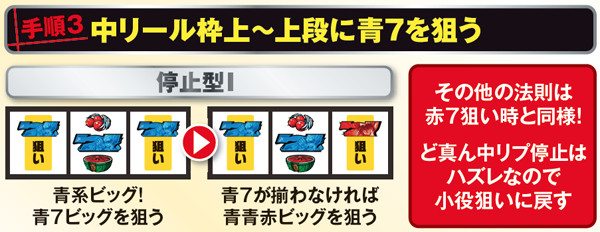 直前に成立したチャンス役にもよるが、まずは赤7ビッグと赤赤青ビッグの2つのフラグを一度に揃えられる赤7を中リールに狙う。これ以外の手順だとチャンス役を取りこぼしたりして逆に損をすることもあるので注意しよう。