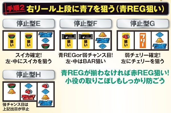 手順1でREG成立が確定したらお次は右リールに青7を目押し。これで青REGが揃わなければ次ゲームは赤REGを狙うわけだが、その際も右から止めるのを忘れずに。出目法則は青7狙い時と同じなので、小役をしっかり取ろう。