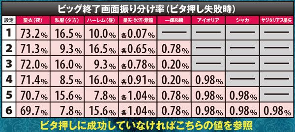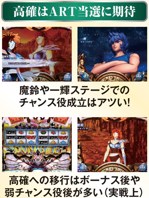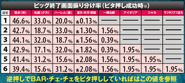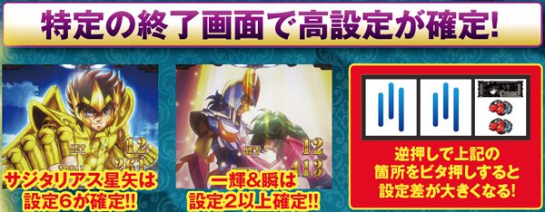 ビッグ終了画面は低設定を否定する、いわゆる「確定演出」が多く、一輝&瞬、アイオリア、シャカ、サジタリアス星矢がそれに該当。また青銅聖闘士が一人のパターンも高設定に期待できる。