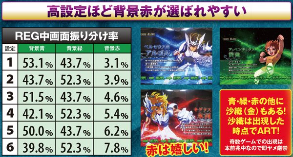 通常時のREGはキャラ紹介をする際に背景の色が3種類あり、最終的な色が青なら奇数設定を、緑なら偶数設定を示唆。赤は高設定ほど出やすく金はART確定だ。