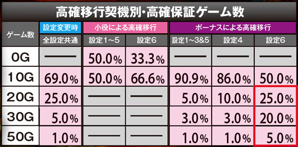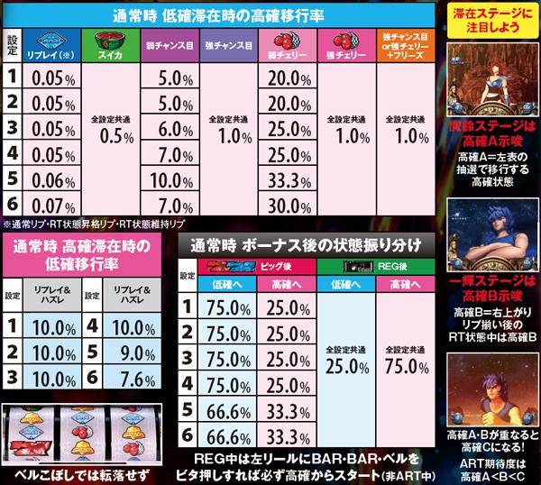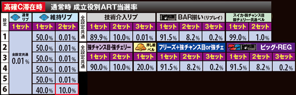 通常時はART当選率に影響を及ぼす「状態」が4種類あり、基本的には高設定ほど高確Aの滞在比率が高い。