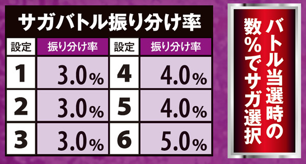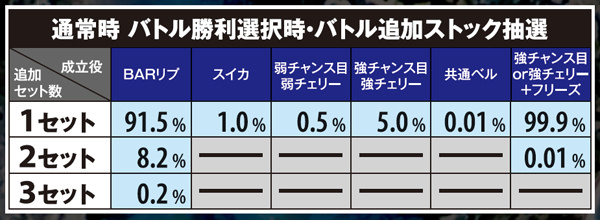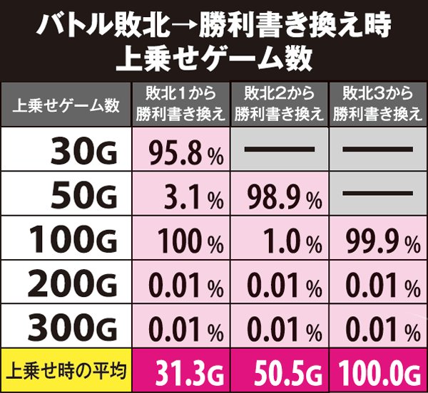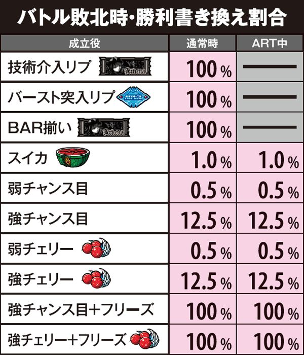 見た目上は勝利と敗北の2種類にしか分からないが、内部的にはバトルの結果は7つに分類される。勝利2・3なら3桁上乗せ確定で、敗北1〜4はその後チャンス役で勝利に書き換えられた際の特典が異なる。