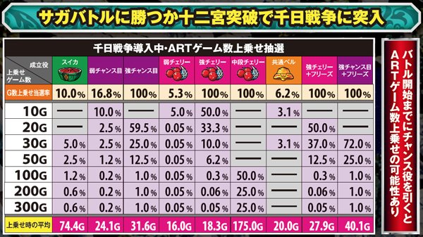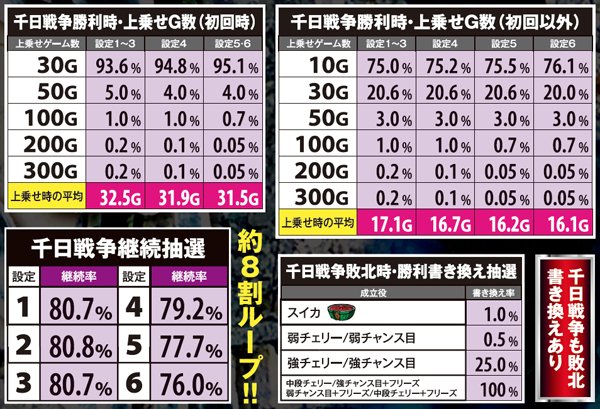 千日戦争は戦いが始まるまで準備状態があり、その際のチャンス役でも上乗せが発生。また初戦は必ず継続するため気合の入れどころは2戦目以降だ。
